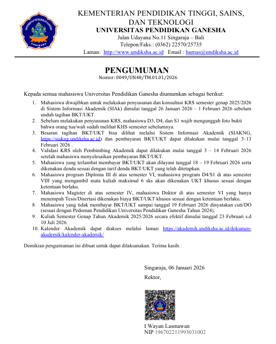- Mahasiswa yang tidak membayar BKT/UKT sampai tanggal 19 Februari 2026 dinyatakan cuti/DO (sesuai dengan Pedoman Pendidikan Universitas Pendidikan Ganesha Tahun 2024).