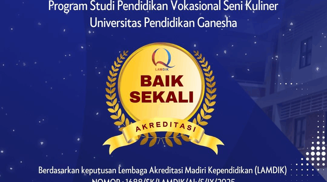 Segenap civitas akademika Fakultas Teknik dan Kejuruan UNDIKSHA mengucapkan Selamat dan Sukses kepada Program Studi Pendidikan Vokasional Seni Kuliner (PVSK) atas capaian Baik Sekali dari LEMBAGA AKREDITASI MANDIRI KEPENDIDIKAN (LAMDIK)  NOMOR: 1688/SK/LAMDIK/Ak/S/IX/2025 berlaku pada tanggal 22 September 2025 sampai dengan tanggal 21 September 2030.