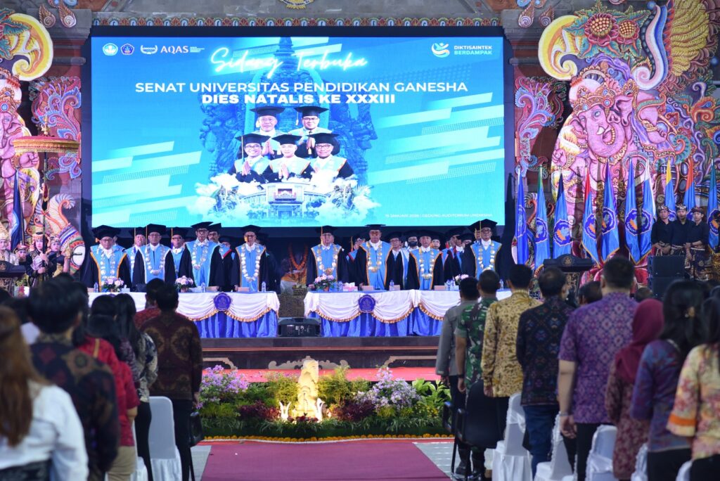 Singaraja, 19 Januari 2026 — Universitas Pendidikan Ganesha merayakan puncak Dies Natalis ke-33 pada hari Jumat, 19 Januari 2026, di Gedung Auditorium Undiksha, Singaraja. Acara tersebut dihadiri oleh jajaran pimpinan Universitas, termasuk Senat Universitas, Rektor dan Wakil Rektor, Dekan, Direktur Program Pascasarjana, serta Kepala LPMPP dan LPPM. Tak ketinggalan, para Ketua dan Sekretaris Jurusan, Koordinator Program Studi, serta seluruh Dosen PNS dan PPPK turut hadir. Selain itu, acara ini juga dihadiri oleh ketua dan sekretaris organisasi kemahasiswaan, seperti MPM REMA, BEM Fakultas, UKM, serta Ketua DWP Undiksha beserta pengurusnya serta undangan lainnya.