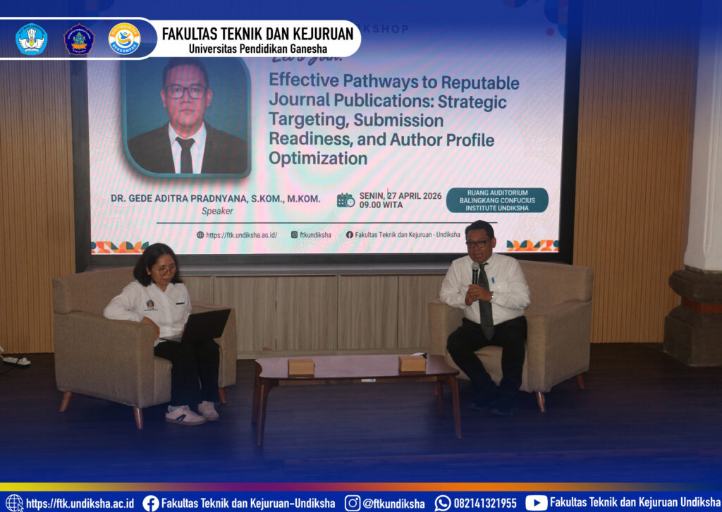 SINGARAJA – Fakultas Teknik dan Kejuruan (FTK) Universitas Pendidikan Ganesha (Undiksha) menyelenggarakan kegiatan Academic Workshop bertajuk “Effective Pathways to Reputable Journal Publications: Strategic Targeting, Submission Readiness, and Author Profile Optimization”. Acara ini berlangsung dengan khidmat di Ruang Auditorium Balingkang Confucius Institute Undiksha pada Senin (27/4/2026).