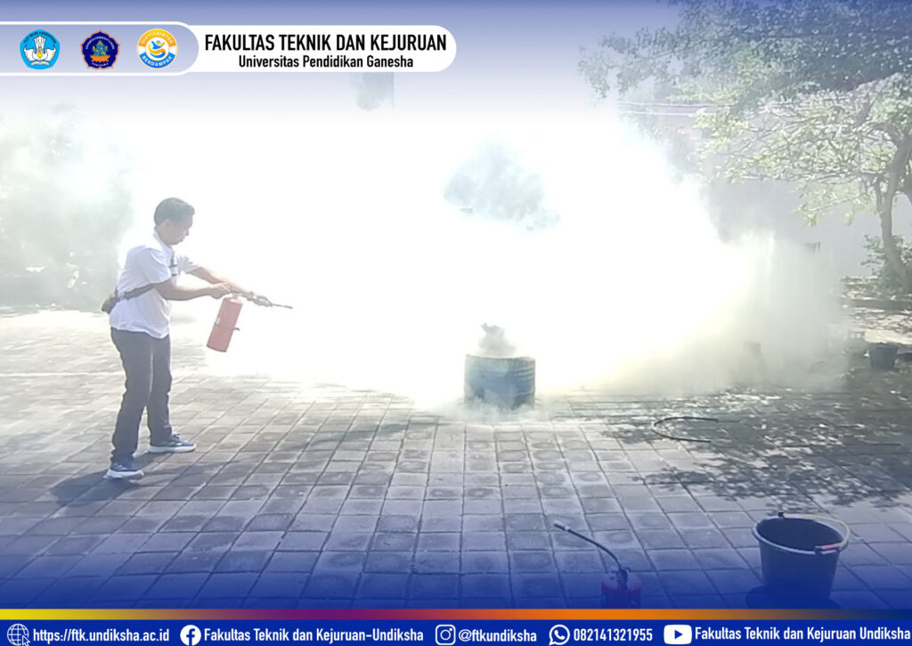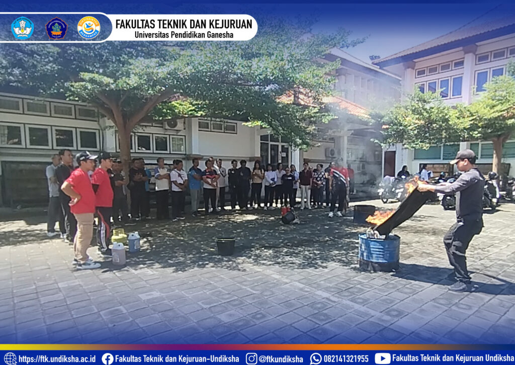 Kegiatan berlanjut ke sesi praktik di Halaman Parkir FTK. Di bawah instruksi langsung personel Damkar Buleleng, para peserta yang terdiri dari dosen, pegawai (Tendik), laboran, hingga perwakilan mahasiswa (BEM), dilatih untuk tidak panik saat menghadapi api. Mereka dipandu melakukan simulasi pemadaman api menggunakan metode tradisional (kain basah) maupun metode modern menggunakan APAR dengan teknik yang aman dan efektif.